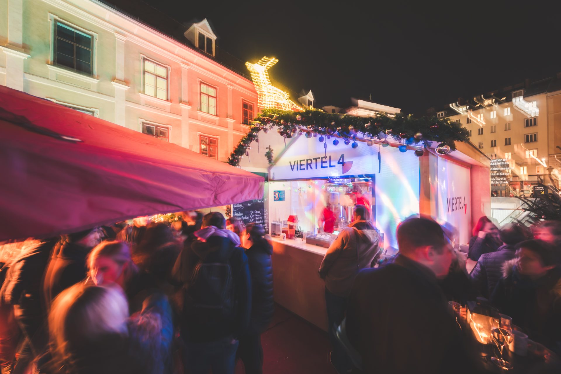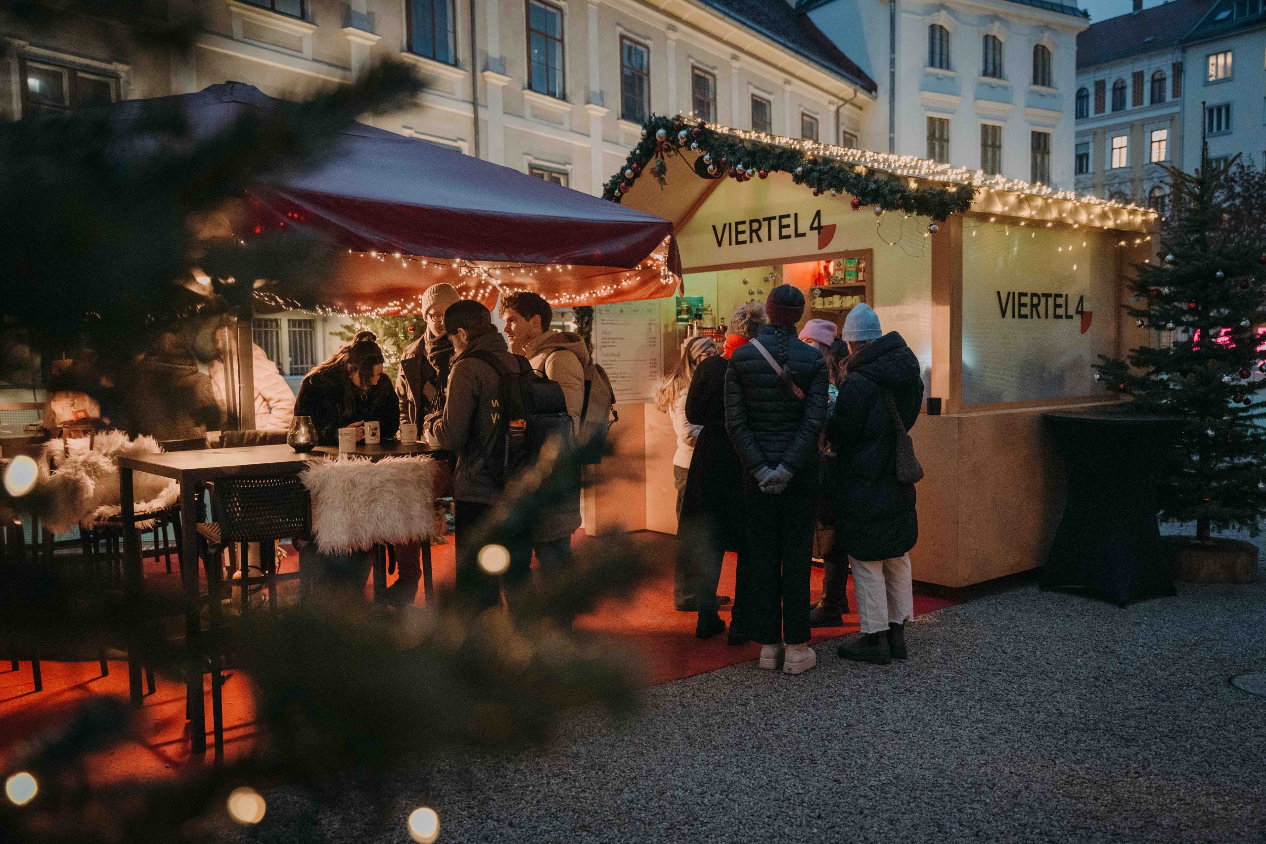 Eingebettet in das Joanneumsviertel erwartet die Besucher:innen inmitten einer bezaubernden Altstadtkulisse eine charmante Melange aus Holzhüttenatmosphäre und beleuchteten Weihnachtsbäumen.